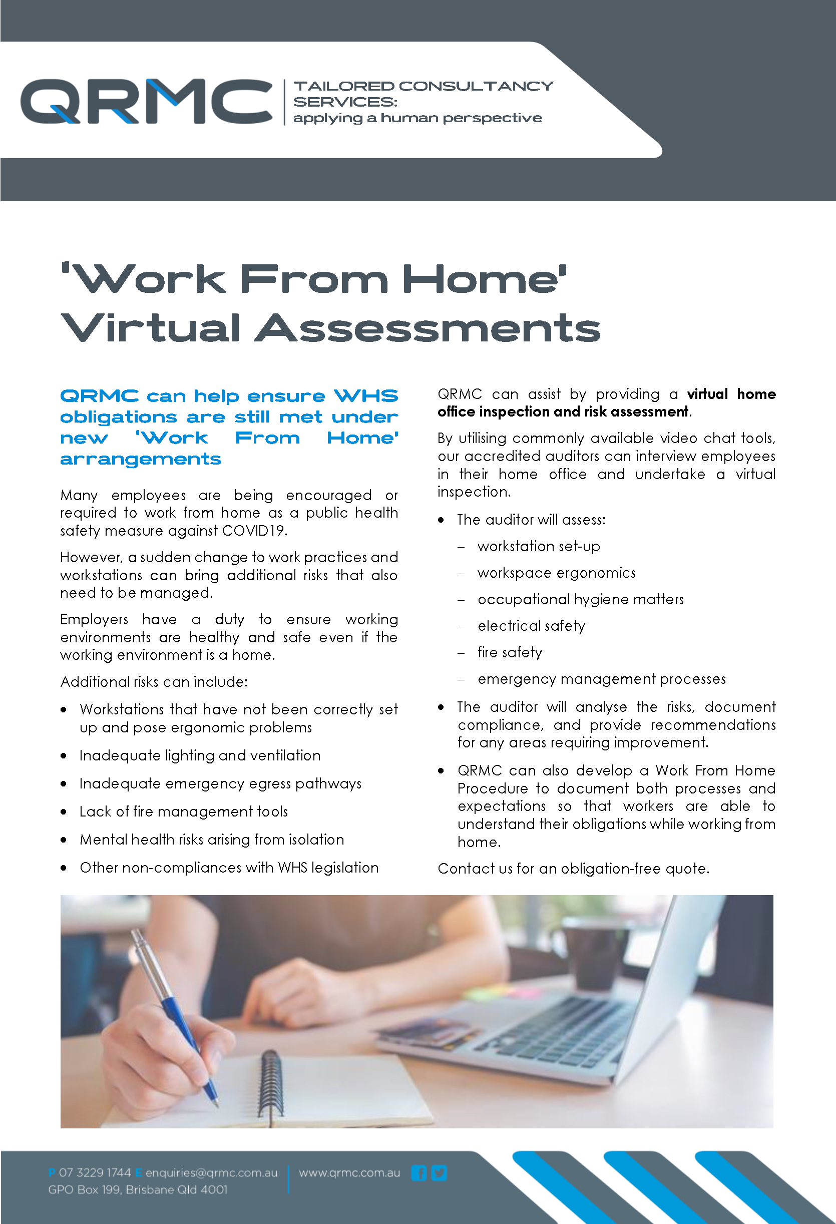 QRMC can assist employers to manage the mass transition of workers from office-based to home-based work arrangements by conducting virtual home office inspections and risk assessments, and developing work-from-home procedures and checklists. Some more detail is available here.